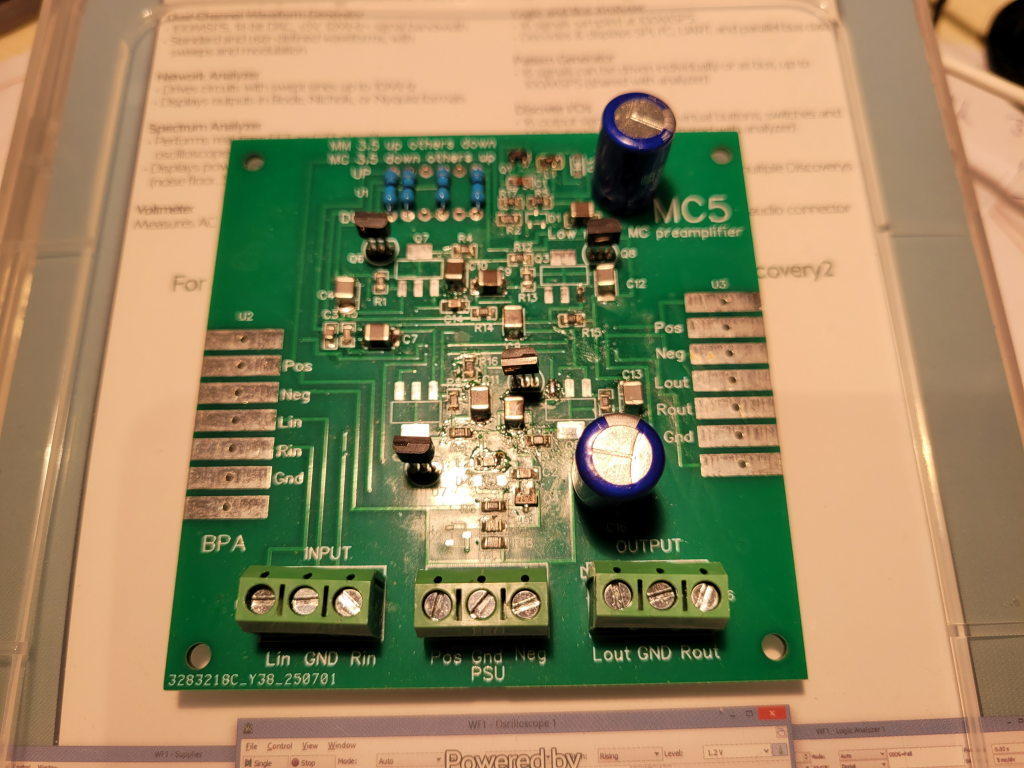 This moving coil pre preamp PCB uses extremely low noise devices. The configuration is a parallel push-pull pair which reduces the noise by a further 1.4 times.