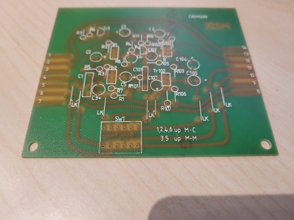 The preamp uses a low voltage supply and is safe for the end user to open.  Two M4 hex socket screws can be removed from the bottom side of the cover.  This will allow the internal chassis to slide out.  The MC PCB is smaller of the two nearer to the rear panel.  The pcb legend has the instructions “3,5 up M-M”.  The switch bank SW1 can be operated with a small screwdriver to do the following:-