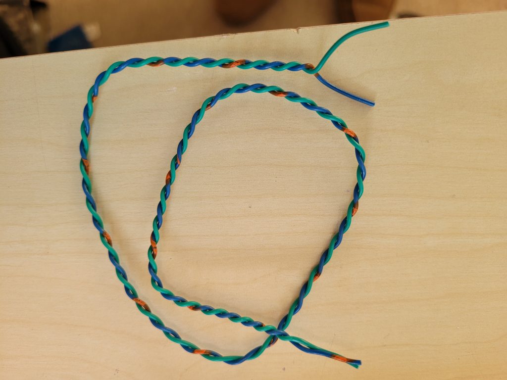 Below is a photo of a suitable DIY cable. This can be made in seconds by clamping two wires in the chuck of a small hand drill, holding the pair some distance away, then spinning the drill chuck. The twist rate is not crucial. I like to use green for signal ground. Solid core wires such as 1/0.6 are easier to use as there are no loose strands to poke out and cause short circuits.